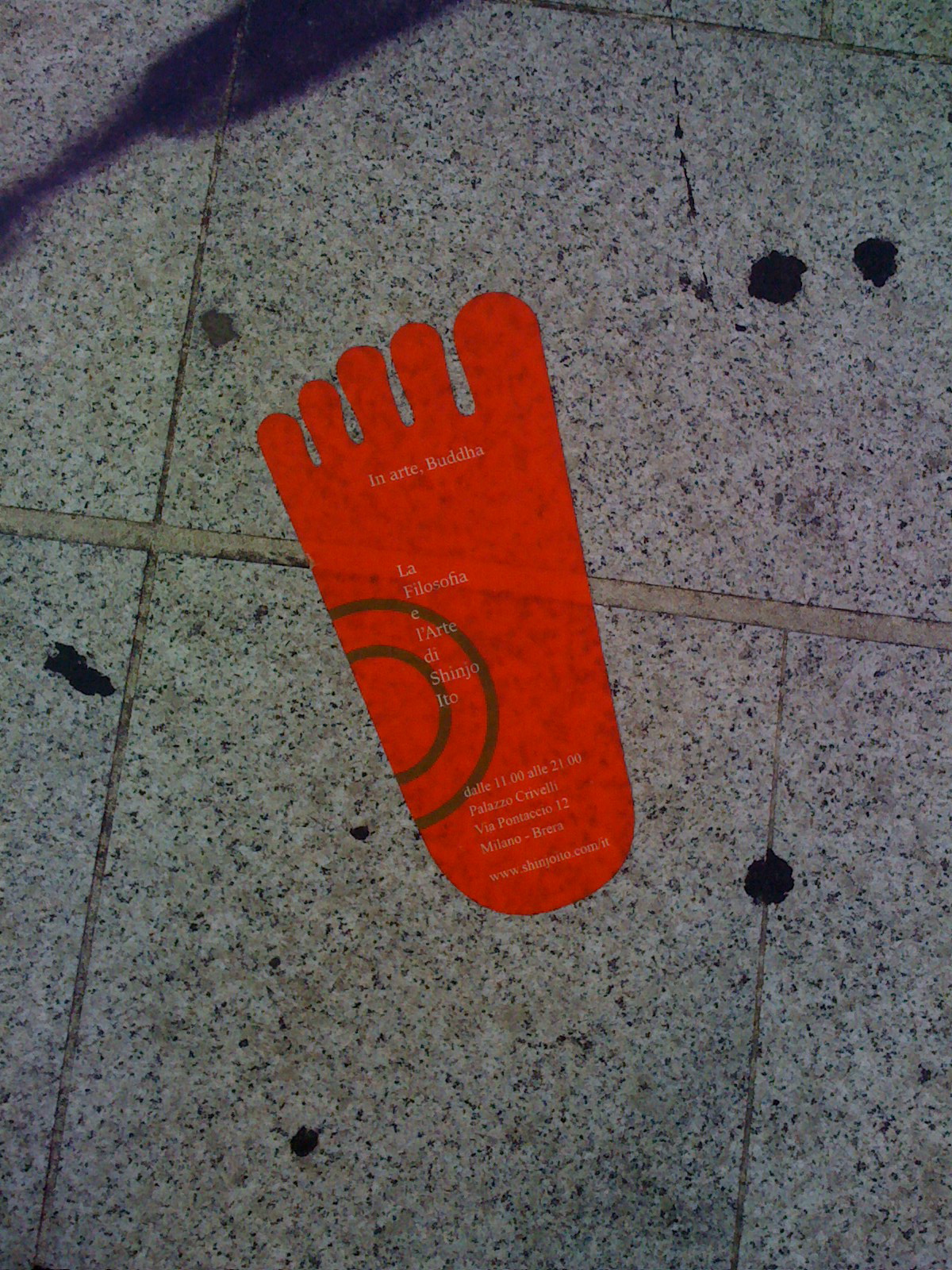 A Milano la mostra itinerante “La Filosofia e l’Arte di Shinjo Ito” ha deciso di guidare i visitatori con sticker a forma di orme che partono da Lanza e da Moscova; inoltre per sottolineare l’importanza dell’evento – costituito anche da conferenze e workshop – ha posizionato un Buddha scolpito da Venanzio Alberti.