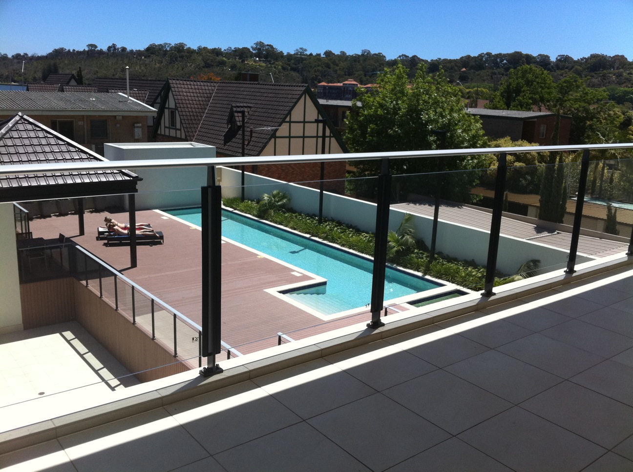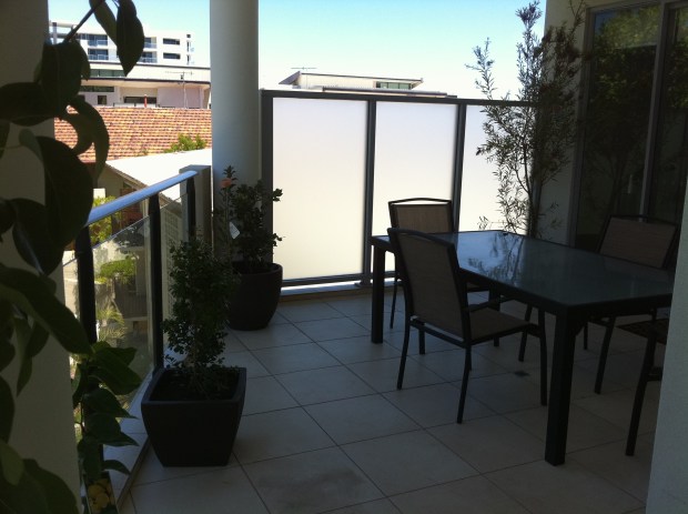 Terrazzo sul retro: da qui vediamo il tramonto e lo Swan River. La piscina, la sauna e la vasca idromassaggio sono parte della casa, le cosiddette aree comuni.